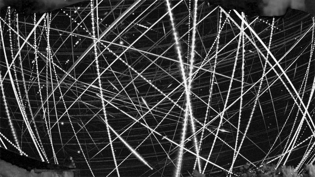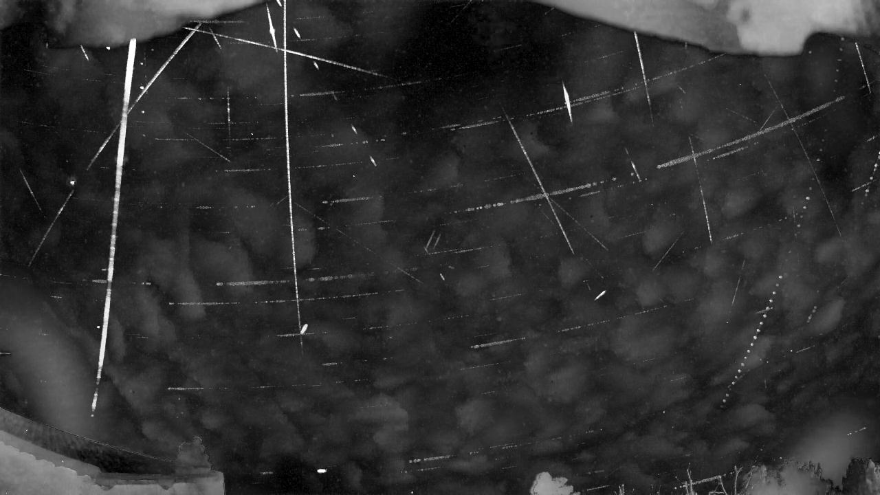 Empilement des instants où un météore a été repéré. Les segments lumineux correspondent aux trajectoires détectées sur le fond étoilé.