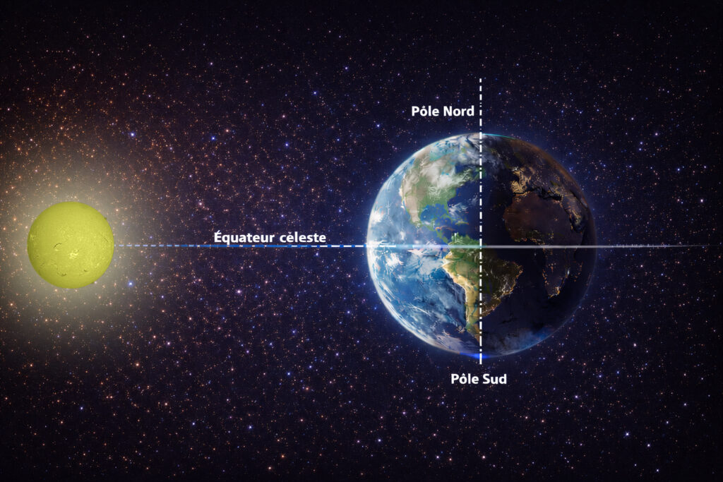 Lors de l’équinoxe, le Soleil se trouve exactement dans le plan de l’équateur céleste. Concrètement, cela signifie que la limite entre la partie éclairée de la Terre et la partie plongée dans l’ombre passe par les deux pôles.