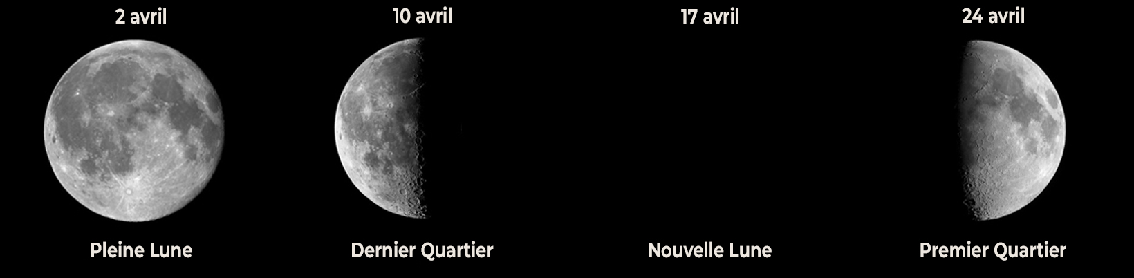 2 avr. Rapprochement Lune / Spica de la Vierge (2,3°) Min à 23h45 A l’œil nu