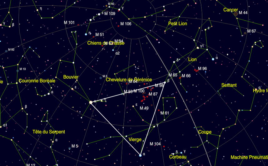 Le ciel du printemps est dominé par un grand astérisme facile à repérer : le Triangle de printemps. Il est formé par trois étoiles brillantes : Arcturus, dans la constellation du Bouvier, Spica, dans la Vierge et Denebola dans le Lion. Visible dès la tombée de la nuit en avril, ce grand triangle imaginaire sert souvent de repère pour explorer les constellations du ciel printanier. Une fois identifié, il devient un excellent point de départ pour partir à la découverte du ciel profond de cette région riche en galaxies.