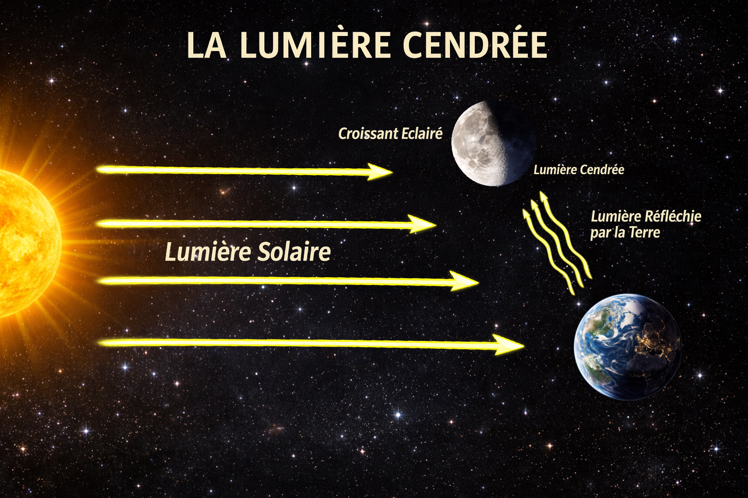 La lumière cendrée est ce doux éclat grisâtre que l’on peut observer sur la partie sombre de la Lune, généralement quelques jours avant ou après la Nouvelle Lune. Ce phénomène fascinant est dû à la lumière solaire réfléchie par la Terre, qui éclaire alors la face lunaire plongée dans la nuit : vue depuis la Lune, notre planète joue le rôle d’une véritable « Pleine Terre ».