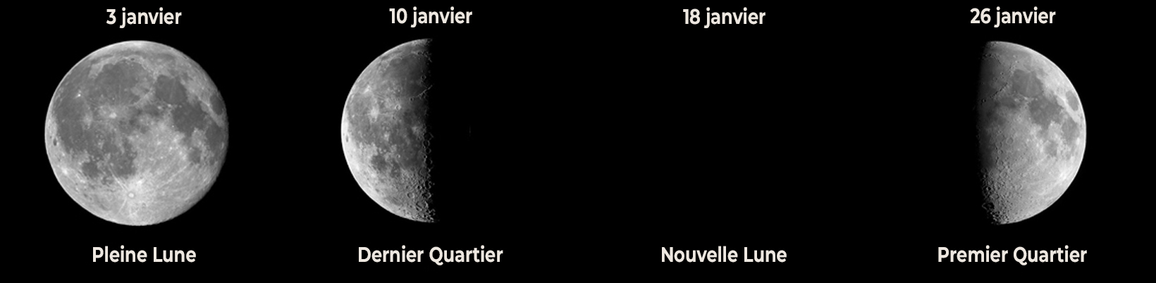 | 03 janv. | Conjonction Pleine Lune / Jupiter (3°) | – | A l’œil nu |